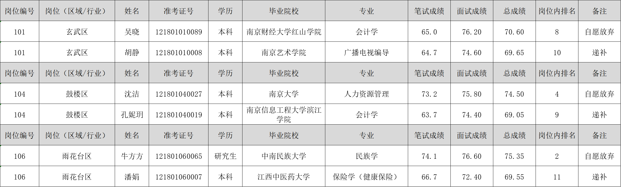 南京市社會化工會工作者招聘擬錄用人員名單已于2023年2月10日進行公示,公示后有部分考生自愿放棄錄用資格,根據招聘公告有關規定,在報考同崗位的考生中按總成績從高分到低分的順序遞補,遞補人員經體檢、考察等程序,現將南京市社會化工會工作者招聘放棄及擬錄用遞補人員名單予以公示: